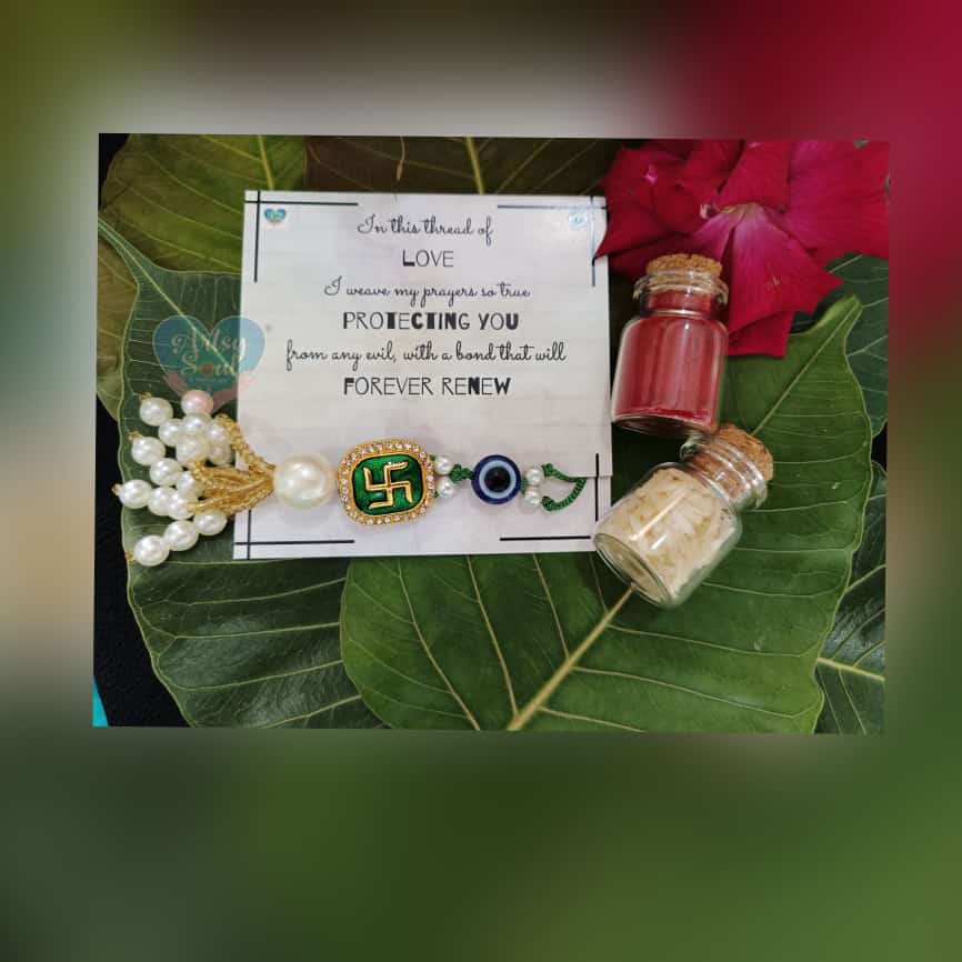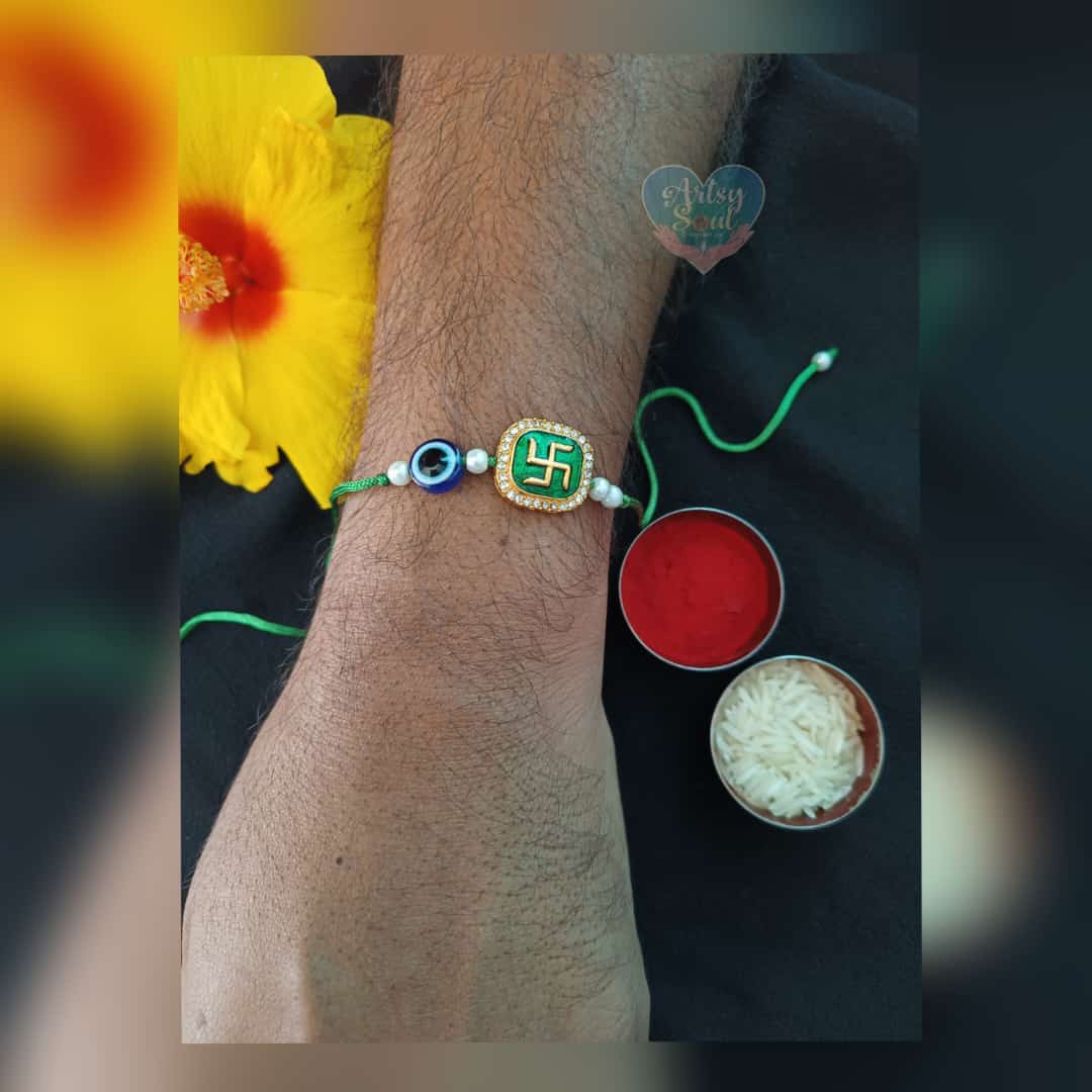 Love’s Emblem: Bhaiya Bhabhi Rakhi in Green with Swastik and Evil Eye. A sacred symbol of protection and blessings, this Rakhi strengthens the bond of love and safeguards their relationship on Raksha Bandhan.