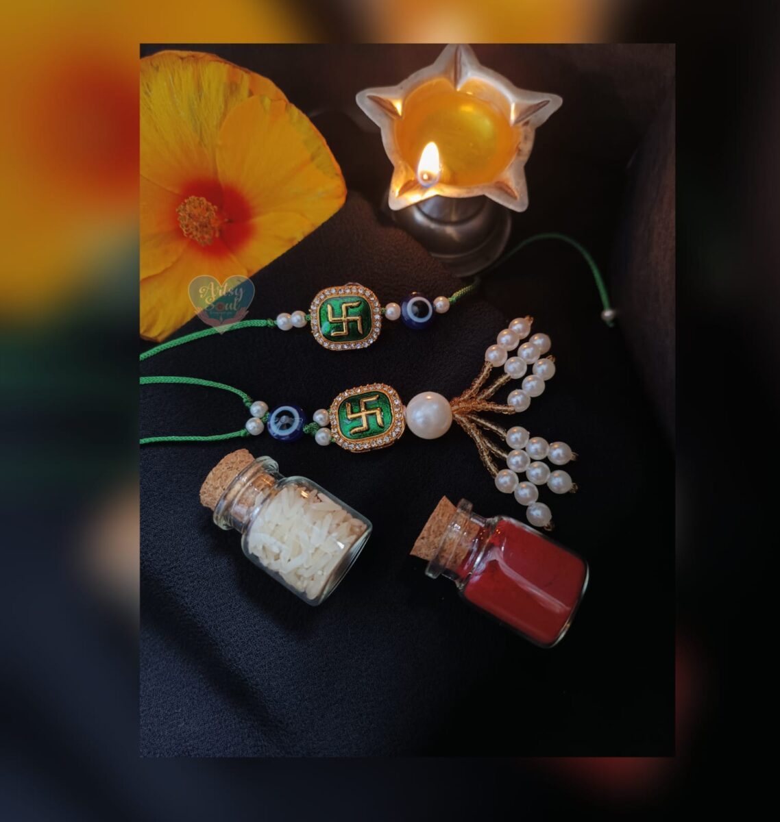 Our Rakhi Comes Delicately Packaged, Accompanied by a Neatly Encased Bottle of Kumkum and Chawal.