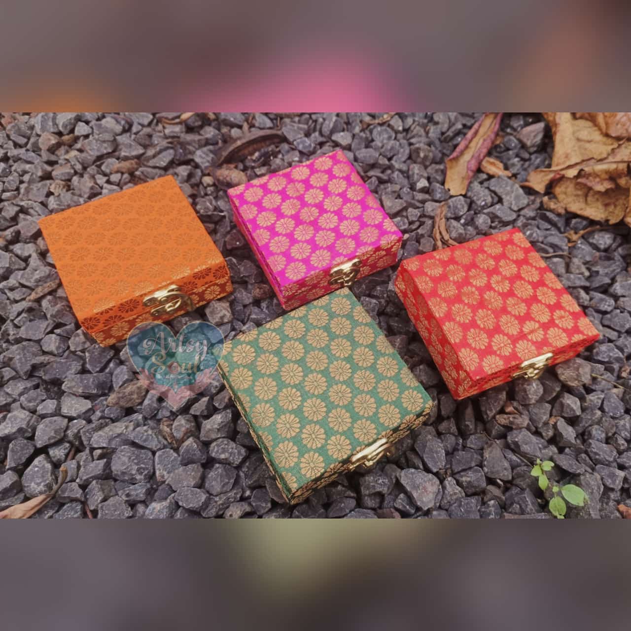 These stunning Charan Paduka symbols, representing the footprints of divine deities, come beautifully embellished with sparkling stones and beads. Encased in a decorative box with a secure clasp, each Charan Paduka is set against a vibrant silk fabric, adding elegance and spiritual significance to any occasion. Available in multiple colors like red, green, blue, and orange, these make for perfect Diwali gifts or religious offerings.